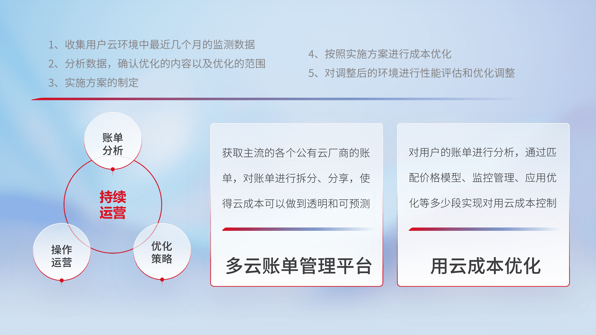 通过多云纳管,,,,以统一的资源数据模型把客户的云资源进行抽象和封装,,进而实现对多云资源的统一操作,,,,保障云资源管理的可靠性、、、稳定性与可用性。。量身定制化运维内容,,,配置、、开发运维、、、、补丁管理、、备份、、、监控、、、、认证和访问管理、、、、审计和日常巡检等,,,,保障在用云过程中的可靠度,,,稳定度以及高可用率。。