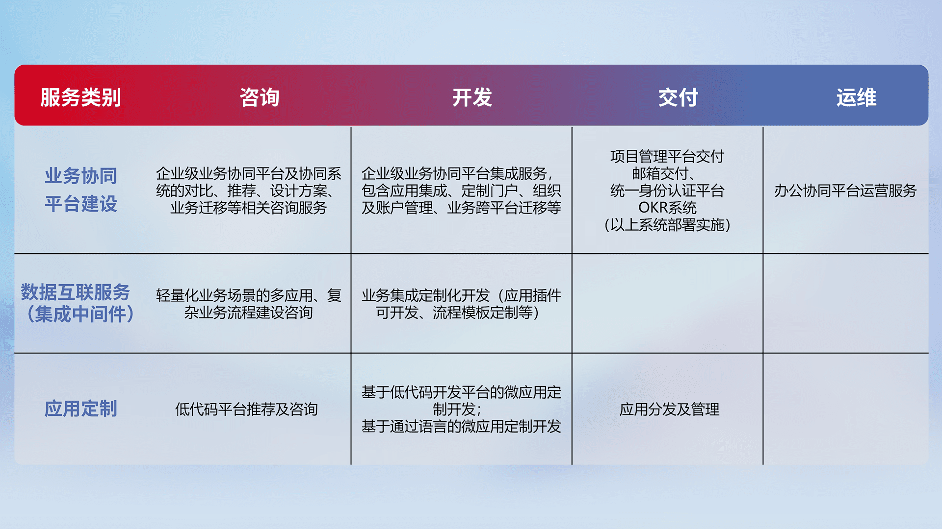针对钉钉、、、、企微、、、IDaas等平台级产品提供产品的规划、、、、方案、、交付、、、定制化开发等服务,,实现如统一协同办公、、、、智能客户服务、、混合会议管理、、、智能数据查询、、、、等业务场景,,实现数字化转型。。